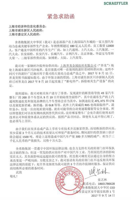 因环保原因,为舍弗勒提供滚针的上游厂家界龙被政府自9月10日起实施“断电停产,拆除相关生产设备”的决定。一纸环保禁令下达,汽车零部件供应商舍弗勒唯一的滚针供应商停产。舍弗勒表示:滚针断供,将造成49家整车厂、200多个车型停产,上汽通用凯迪拉克和别克品牌首当其冲,包括如凯迪拉克ATS、XT5和CT6、以及别克新君威、新君越、新GL8等车型,预计损失达3000亿人民币!